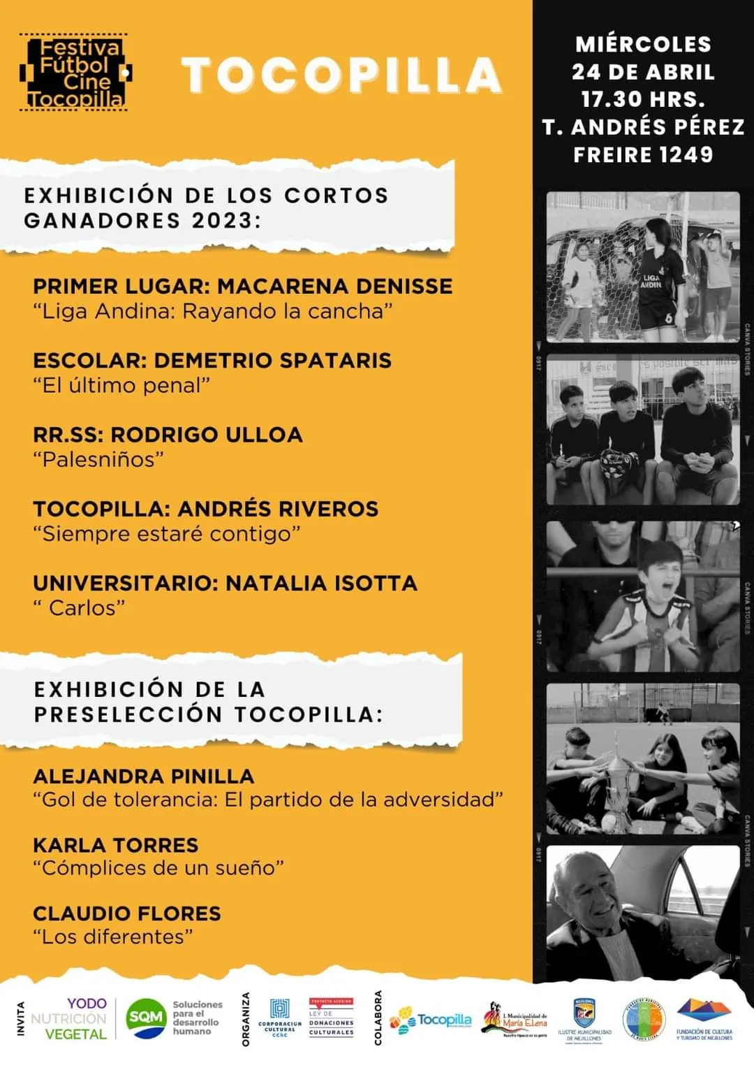 Este hito formó parte del programa inaugural, que contempla comenzar este miércoles 24 al domingo 28 de abril en distintos puntos de la región, cuyo puntapié inicial será en el Teatro Andrés Pérez de Tocopilla con la exhibición del cortometraje “El Niño de Tocopilla”, realizado por el ganador de la primera edición, de Rubén Martínez, quien documentó el periplo de Andrés y Leandro a Milán, una odisea que se materializó gracias al premio obtenido por esta dupla en el Festival 2023.