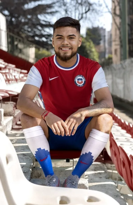 El color rojo predomina en la nueva equipación de la selección chilena, En el perfil se puede advertir el detalle de la franja con símbolos mapuche.