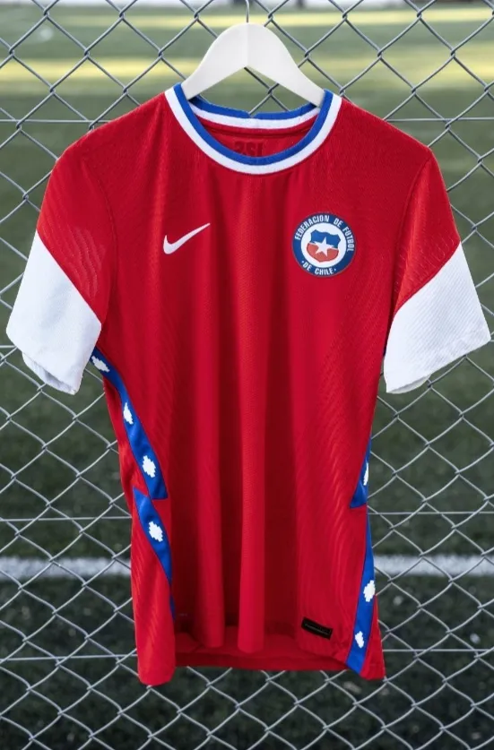 El modelo cuenta con varias novedades. En su edición home, para partidos como local o anfitrión, se mantiene el color rojo distintivo pero con una aplicación especial: una estrecha banda azul con símbolos mapuche bajo la manga. Pero quizás el mayor detalle estético es la presencia del blanco en las mangas, con un corte diagonal desde la línea del hombro. Además, la primera camiseta lleva un cuello redondo y bicolor en blanco y azul.