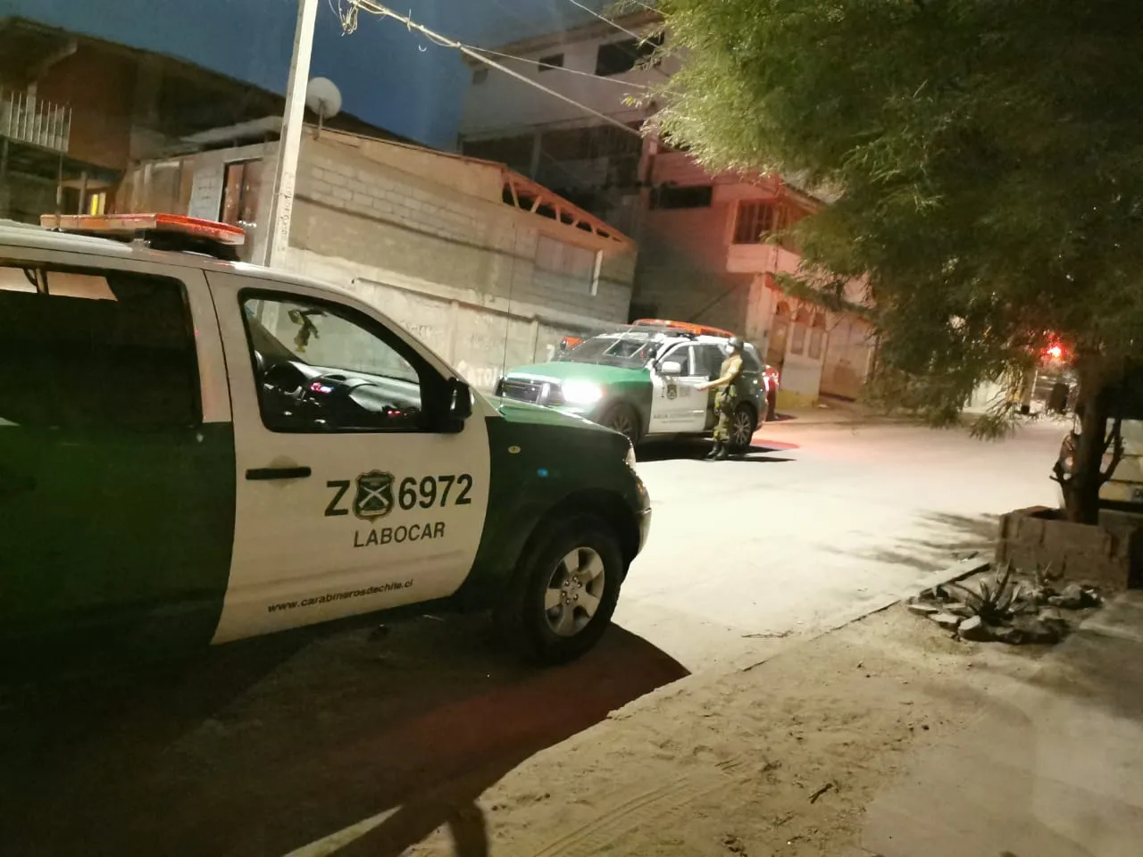 A las 22.45 horas, mientras Carabineros se encontraba en el situo del suceso de homicidio en calle María Elena reciben información que en pasaje Los Auquénidos 2 sujetos habrían agregido y amenzado con armas de fuego a una persona y se encontrarían al interior de un domicilio en pasaje Los Auquénidos.