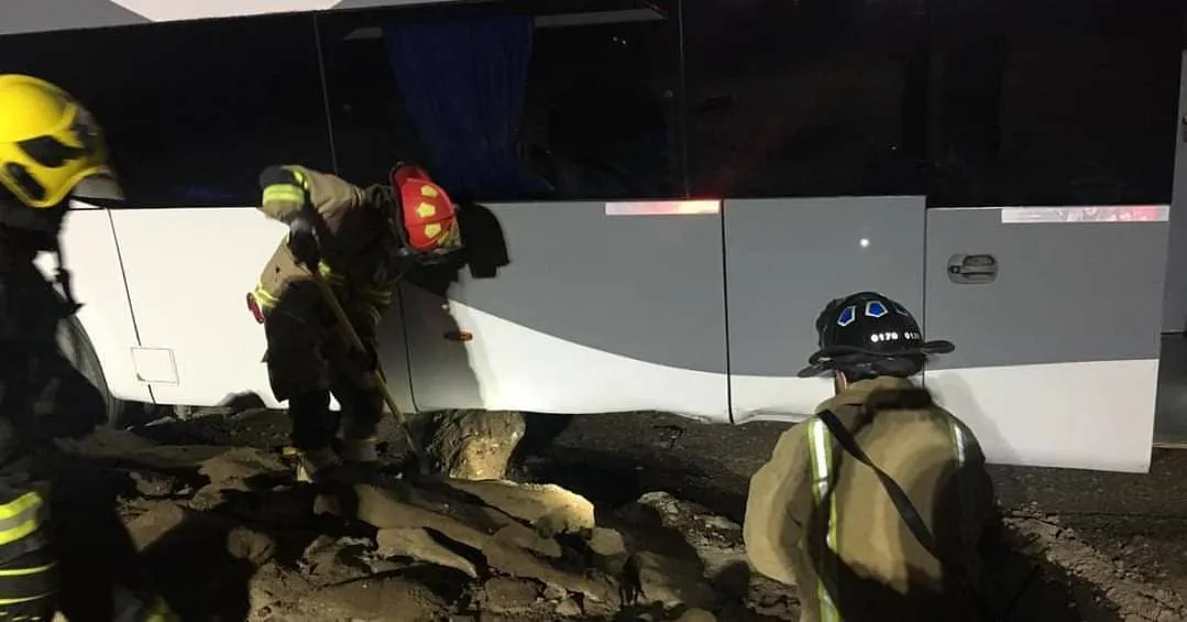 Al llegar el personal el vehículo se encontraba detenido a un costado de la ruta, producto de desperfectos mecánicos sufridos a raíz de un golpe con una piedra que dañó el estanque de combustible del bus.