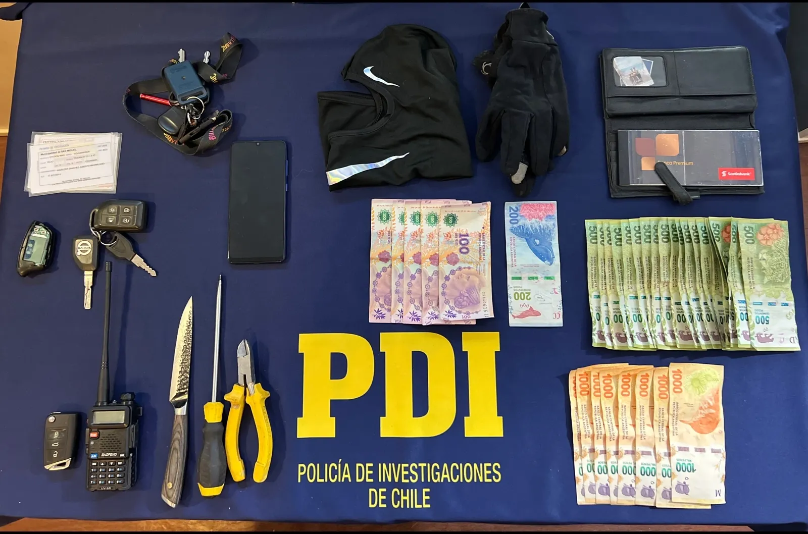 Tras una inspección detallada del interior del móvil, se hallaron elementos conocidamente utilizados para la comisión del delito de robo, además de la cantidad de 18.700 pesos argentinos, llaves de vehículos y un radiotransmisor handie, entre otros.