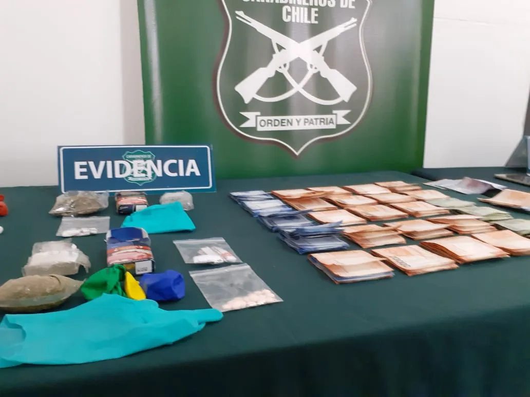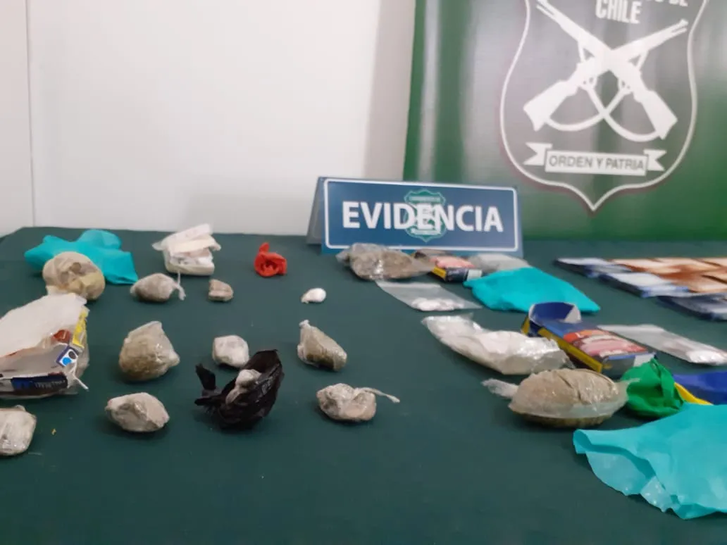 144 gramos 920 miligramos de marihuana.4 gramos 480 miligramos de cocaína base.1 gramo 280 miligramos de clorhidrato cocaína.203 comprimidos de clonazepam a granel con peso de 41 gramos 860 miligramos.$ 2.478.000 en dinero efectivo.9 teléfonos celulares.1 vehículo incautado ley 20.000