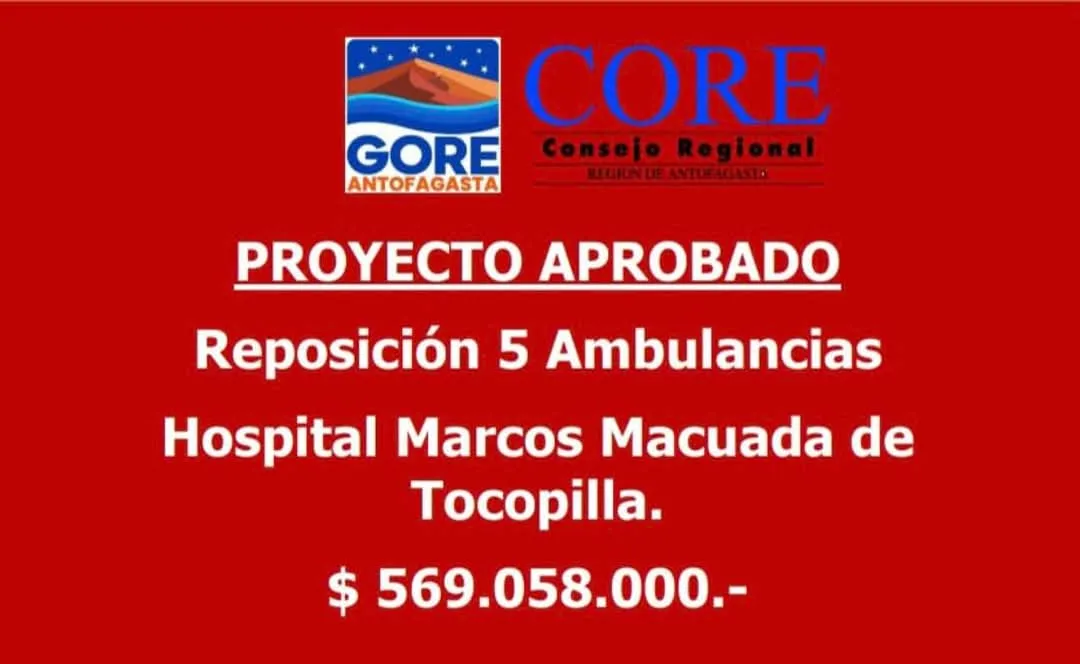 El Consejero Humberto Fuentes señaló: "Hoy es un día importante para Tocopilla. Se aprueba la reposición de 5 ambulancias para el Hospital Marcos Macuada, una necesidad urgente que responde directamente a las demandas de nuestra comunidad. Como consejero regional, me alegra profundamente que se visibilicen y prioricen las necesidades reales de nuestra provincia. Este es un paso concreto en el fortalecimiento de la salud pública y en el compromiso por el bienestar de nuestra gente".